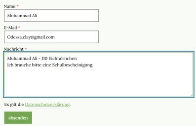 Nachricht: Wiederholen Sie den Namen Ihres Kindes, nennen Sie die aktuelle Klasse und formulieren Sie den Wunsch nach einer Schulbescheinigung.